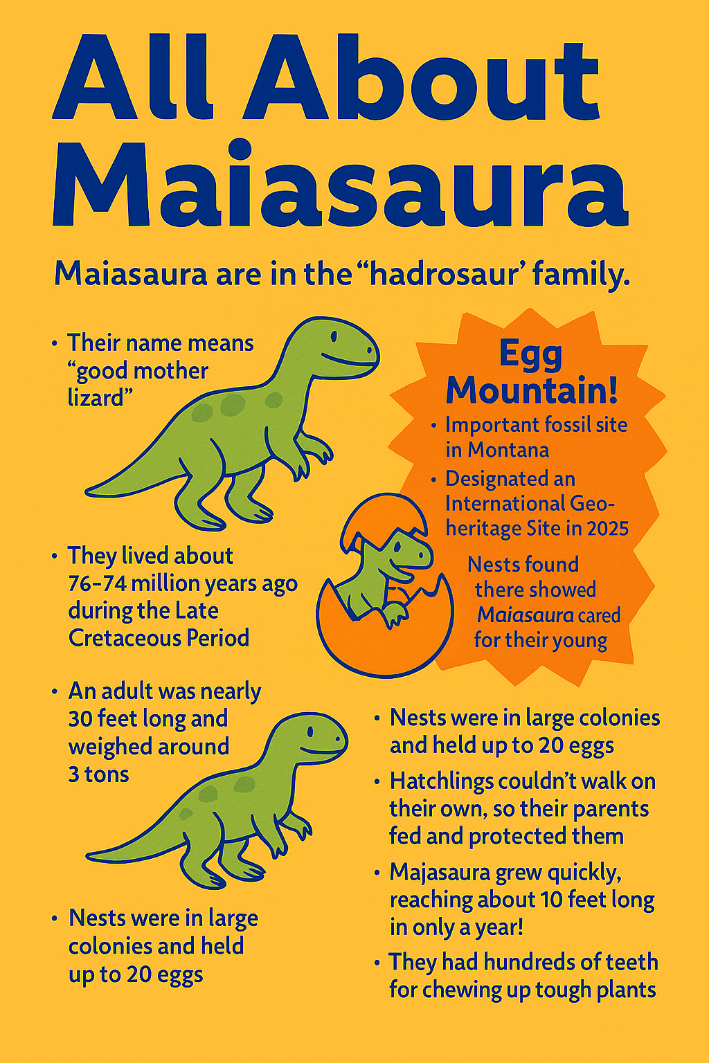 In 1985, Montana schoolchildren helped make Maiasaura the official state fossil. They wrote letters, collected thousands of signatures, and even baked dinosaur cookies for lawmakers! Thanks to their efforts, Maiasaura became a symbol of Montana’s amazing dinosaur history.